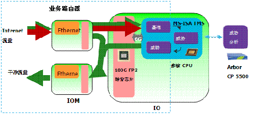 图中表示的是上海贝尔的MS-ISA TMS基本的架构。其中Peakflow SP设备(CP-5500)通过网络行为分析发现了异常然后通知TMS业务路由器去做有针对性的清洗。为了保证业务路由器的MS-ISA DDoS威胁清洗设备在应用中不会成为瓶颈: